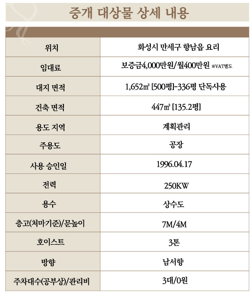대지 1,652㎡ 500평 / 건축 447.3㎡ 135평 / 연 447.3㎡ 135평 평