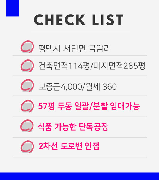 소형 공장 임대 60평이하,300평 이하 중형,식품공장,단독마당 공장